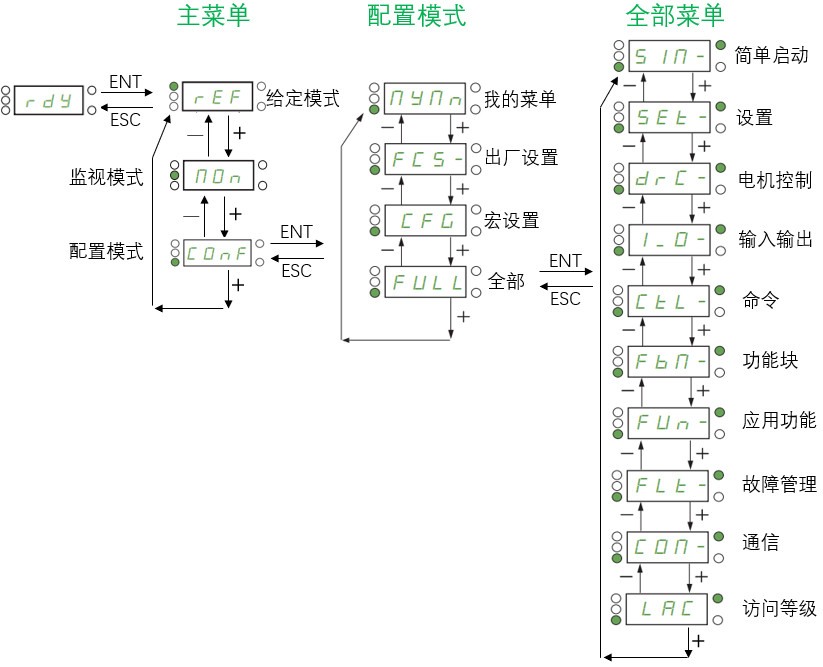 问题描述:ATV320变频器如何进入菜单修改参数?所属产品线:ATV320变频器解决方法:ATV320变频器按钮操作方法:下面介绍主菜单、配置模式、全部菜单结构以及如何进入全部菜单。